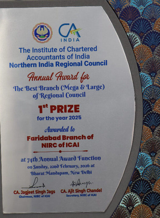 The Faridabad Branch of NIRC of ICAI was awarded the First Prize in the Best Branch (Mega & Large Category) for the year 2025 at the 74th Annual Award Function held in New Delhi. This prestigious recognition reflects the branch’s outstanding performance, commitment to excellence, and significant contribution towards professional development, innovation, and active engagement within the ICAI community.